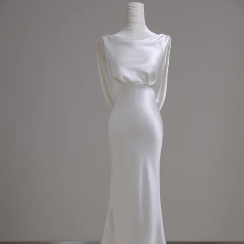 For brides who adore vintage-inspired designs, the Vintage Sheath Silk Wedding Dress with Long Sleeves is a dream. This dress features a timeless sheath silhouette that gently skims the body, creating an elegant and sophisticated look. The long sleeves add a touch of modesty and grace, making it perfect for traditional or formal weddings.
